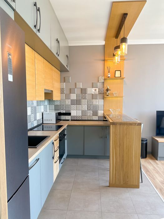 авторська кухня з барною стійкою кольору оливкової олії, плитка в дусі арт-деко, преміальні розетки Berker, дизайнерське освітлення й повітря, наповнене світлом.