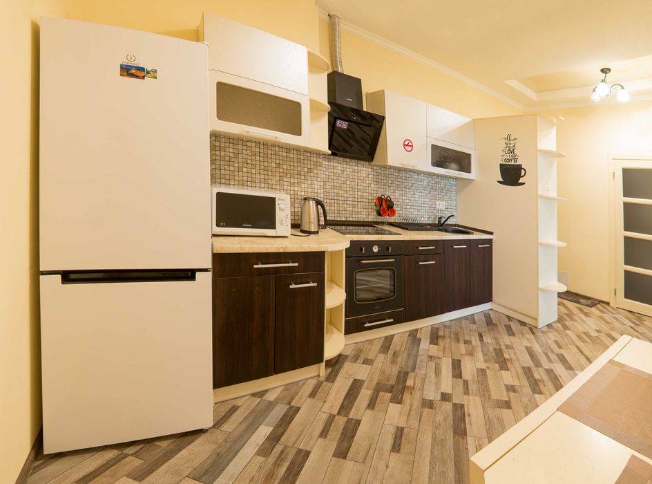 Просторная кухня со всей необходимой техникой: холодильник, микроволновка, встроенная варочная поверхность, духовой шкаф, набор посуды, пылесос, утюг, гладильная доска.