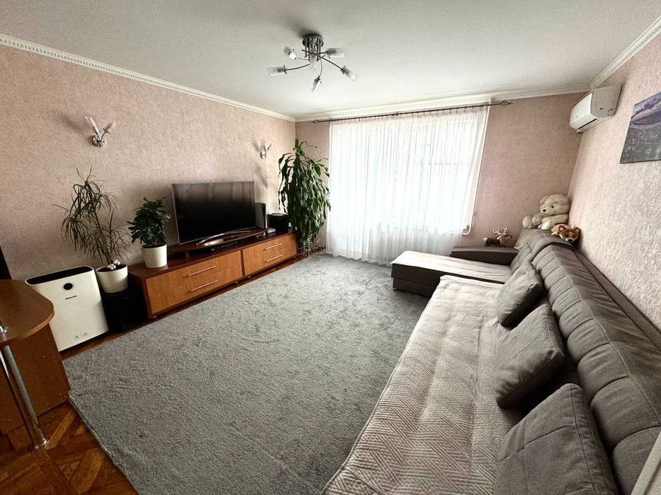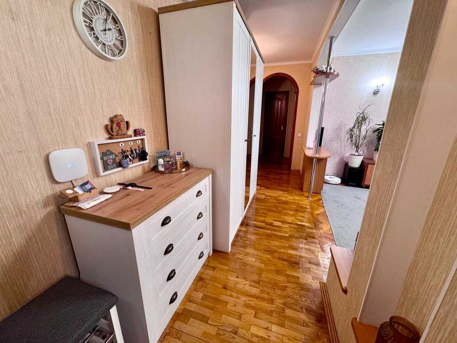Квартира знаходиться на восьмому поверсі девʼятиповерхового будинку. У квартирі дві окремі спальні, велика вітальня та кухня.