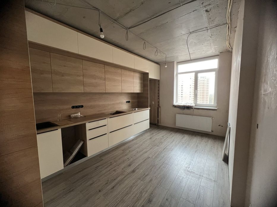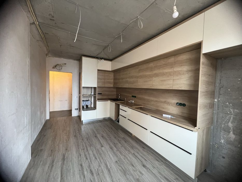 Кухня на полу spc ламинат , установлена заказная кухня на всю стену, до потолка, верх двухуровневый, низ выдвижные ящики, ниша под холодильник 70см шириной 2100см высотой, есть место под встроенную духовку и встроенную микроволновку, место под посудомойку, установлена черная раковина керамогранит Franke , водоочиститель аквафор трио с отдельным краном.