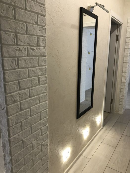 • Дизайнерский ремонт: Интерьер в стиле монохром с элементами лофта. Белый декоративный кирпич, стильное освещение и продуманные детали.