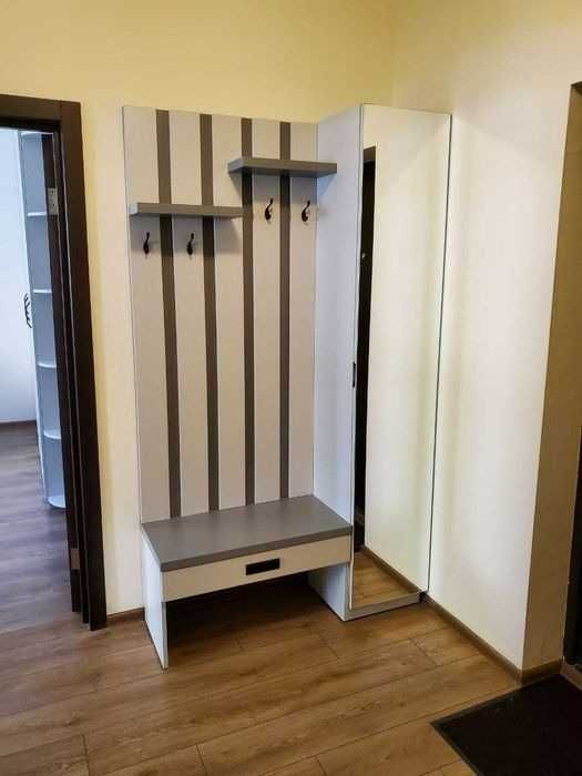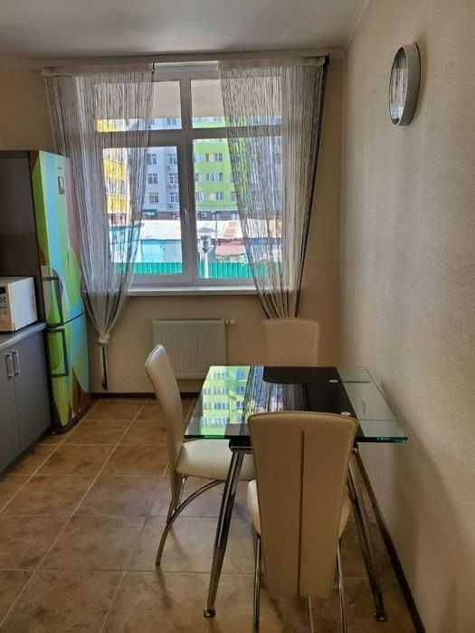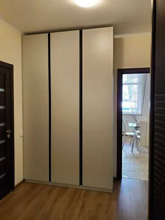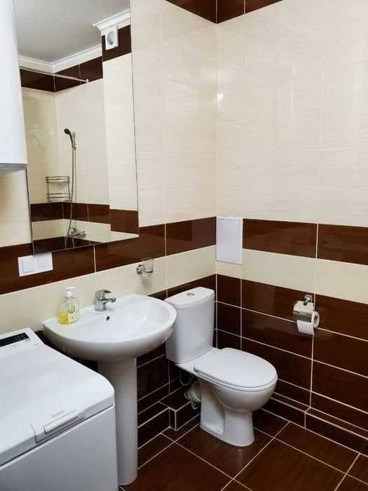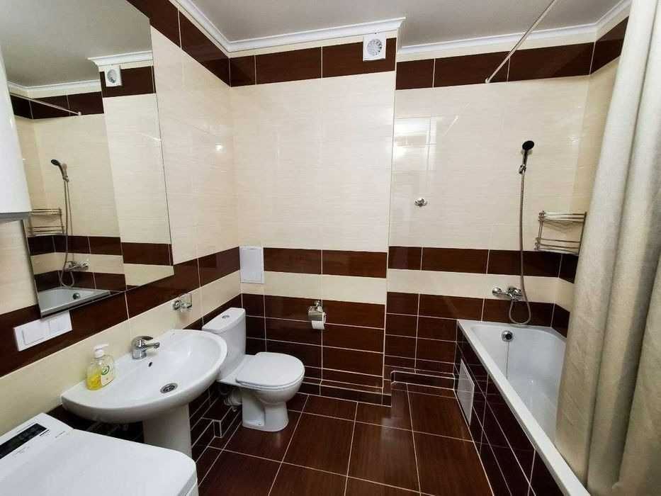 Загальна площа — 43 м²: спальня-гостьова — 20 м², кухня — 11 м², хол — 7 м². Квартира світла, затишна, виконана в сучасних світлих тонах, повністю мебльована та обладнана новою технікою: вбудована кухня, холодильник, варильна поверхня, духовка, мікрохвильова піч, кухонний стіл, посуд, у спальній-гостьовій — новий диван, стіл для комп’ютера, тумба, телевізор, місткий шафа, крісло, кондиціонер, ламинат, склопакети. В санвузлі — нова сантехніка, ванна, унітаз, пральна машина, бойлер 80 л, місткий шафа, у холі — роздягальня, шафа та тумба.