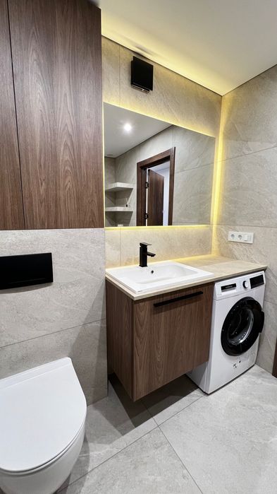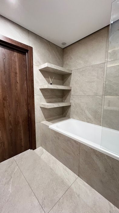 а стильним акцентом стали вбудовані полиці з плитки — практично і дуже сучасно.