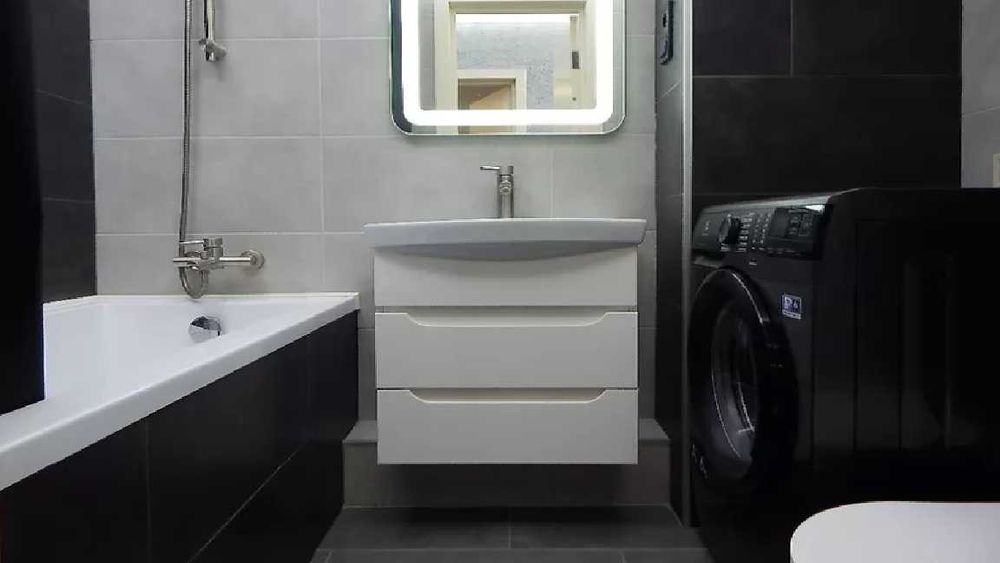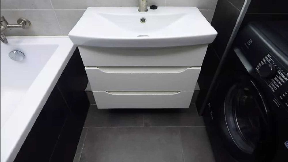 - Санузел, совмещенный: ванна, стиральная машинка, бойлер, подвесной умывальник с тумбой