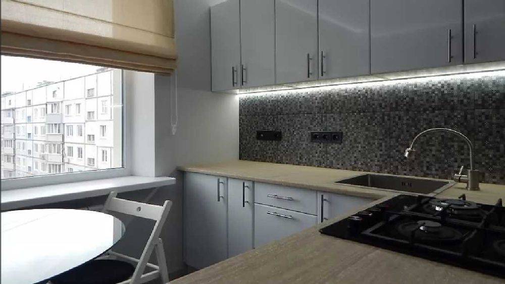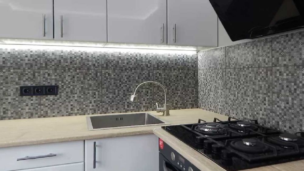 - Кухня: кухонная линия, встроенная техника (духовка, варочная поверхность, вытяжка), холодильник