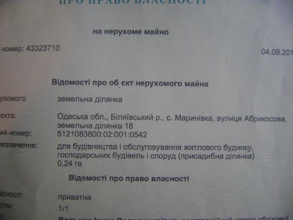 Земельный участок под Одессой. Срочно.; Продам участок. 24 сотки. Улица Абрикосовая, 18. Мариновка. Одесская обл. 30 км от города. 20 мин езды. Дорога ровная прямая. Отличное место для дачи или же для часного домика недалеко от города. Участок правильной формы, дорога с двух сторон, документы под застройку, документы готовы, все коммуникации по участку. На участке 240 кустов винограда. Видно Хаджибеевский лиман, 5 мин ходьбы. Прекрасное место, чистый воздух, красивая природа, а главное Одесса вовсем рядом. Ездит маршрутка и автобус. Школа, садик, магазины, и, даже, баня