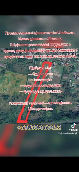 Земельна ділянка; Продам дві земельні ділянки розташовані в самому місті Любомль. Кожна ділянка 75 сотих. Можна придбати дві разом. 1.5 га. Все приватизоване. Документи в порядку. Під бізнес, ведення господарства, постройки любого типу. Все звлежить від вашого бажання. За деталями звоніть. Показати можна в любий день. По домовленості на конкретну годину.