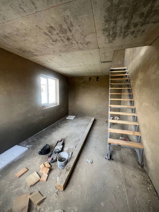 У будинку вже зроблені сходи, все виведено та на всіх поверхах зроблена штукатурка