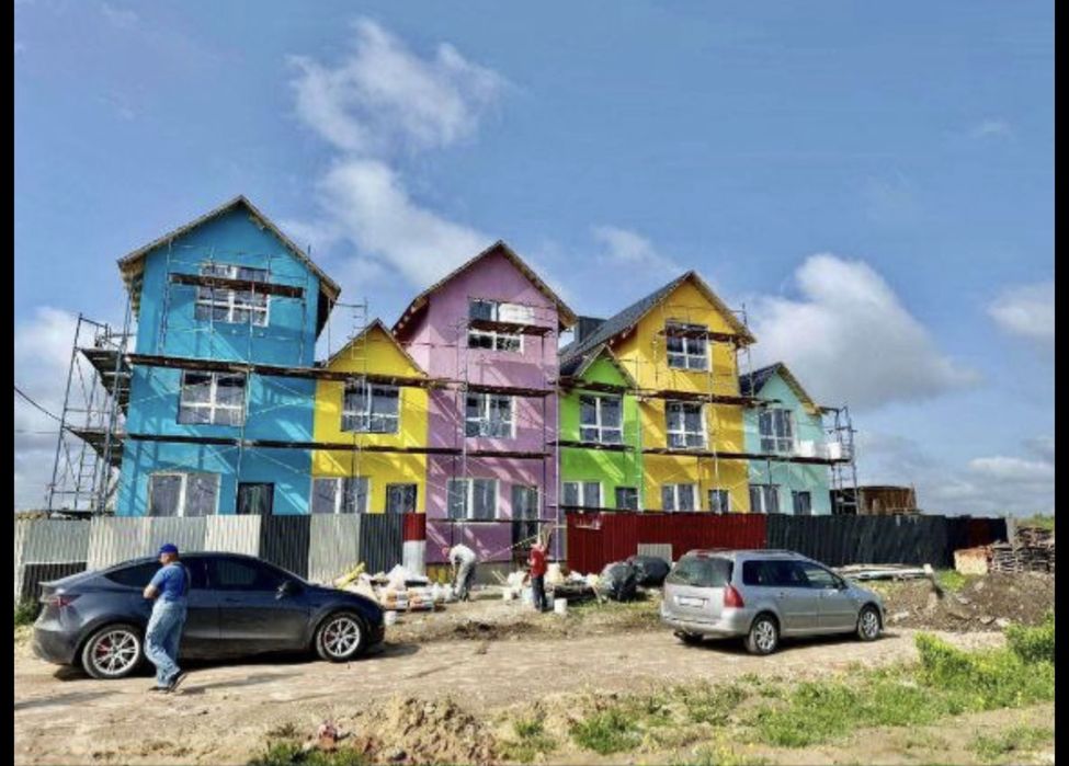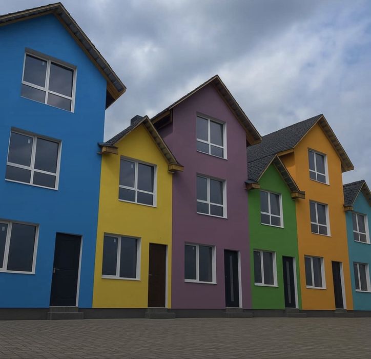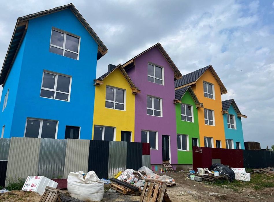 Продаж трьхповерхового будинку; Продам трьохповерховий будинок, на фото - синій. Має три поверхи, кожен поверх 21-22 метри квадратних, будинок боковий, тому має більше вікон ніж у сусідніх та більшу територію.
