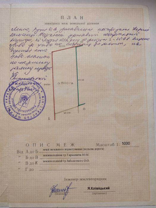 Ділянка приватизована, рівна, прямокутної форми, одразу біля дороги, є можливість розділення на дві чи три ділянки на декількох власників з власними заїздами.