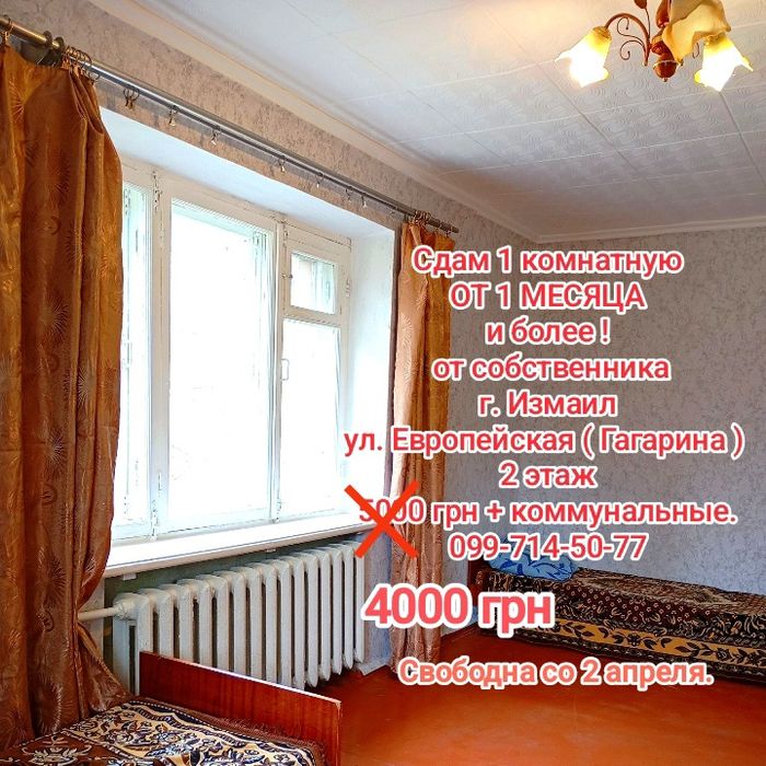 Сдам 1 комнатную ОТ 1 МЕСЯЦА Гагарина от собственника; От собсивенника. Гагарина. 4000 грн. + коммунальные. Залог 2500 грн.