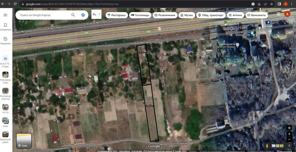 Участок под застройку под Киевом!; Продається дві ділянки 0,15 га і 0,17 га під Києвом 18 км 15 хв їзди в селищі "Березівка", що росте і розвивається. Навколо селища виросли котеджні містечка такі як "Нова Березівка", "Северинівка", Лелечий Хутір, а також виставковий комплекс КиївЕкспоПлаза, до якої ходило розвезення ст. метро Житомерська. До війни працювало 5 ресторанів та 3 магазини!