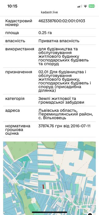 Земельна ділянка біля Львова; Земельна ділянка правильної форми у с.Вільховець площею 0.25 га. Ділянка під невеликим нахилом, родюча земля , неподалік ліс і водойма. Від Львова до ділянки 25 км по асфальтній дорозі. Всі документи порядок( є проєкт будинку). Продаж від власника, (не терміново). Реальному покупцю торг