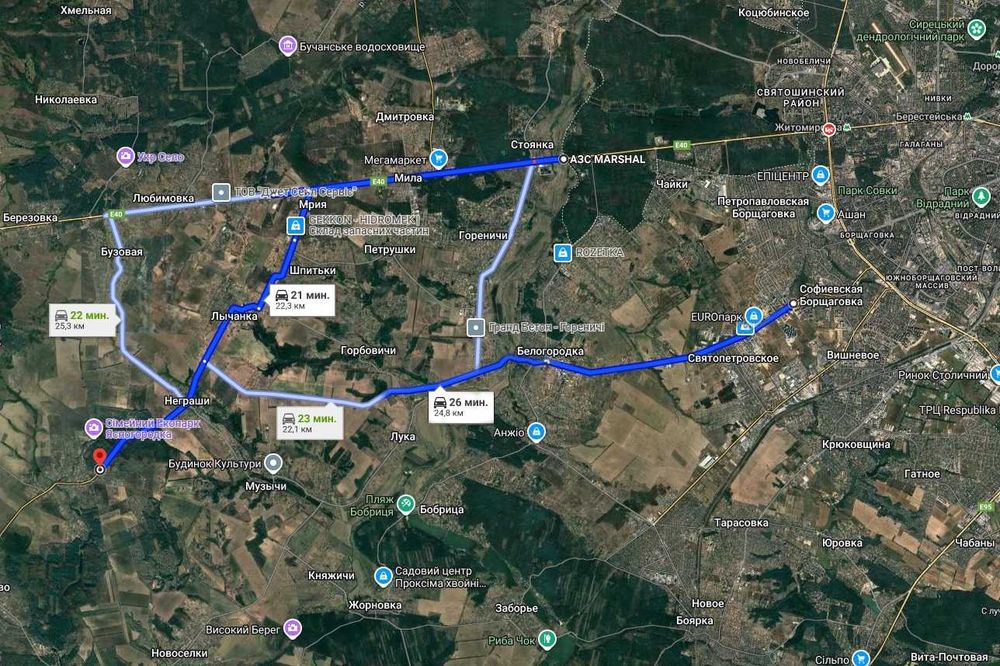6. При большой загруженности южного направления (это Гатное Гатне и Вита Почтовая Віта Почтова) что очень актуально в пятницу и воскресенье, вы всегда сможете объехать Чабаны через Новоселки, а Мархалевка Мархалівка и Иванковичи Іванковичі через Хотов. По пути объезда у вас будет возможность отдохнуть в поселке Круглик на их шикарных озерах которые берут свое начало аж из города Васильков Васильків.