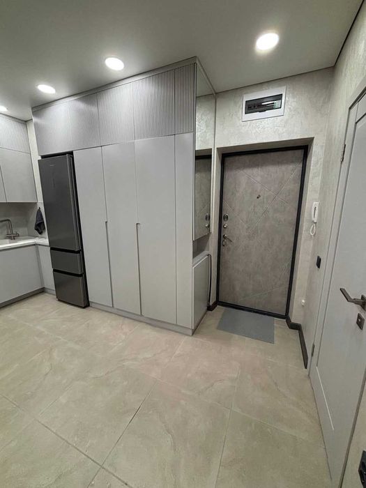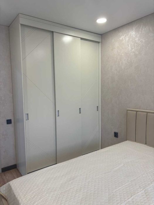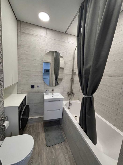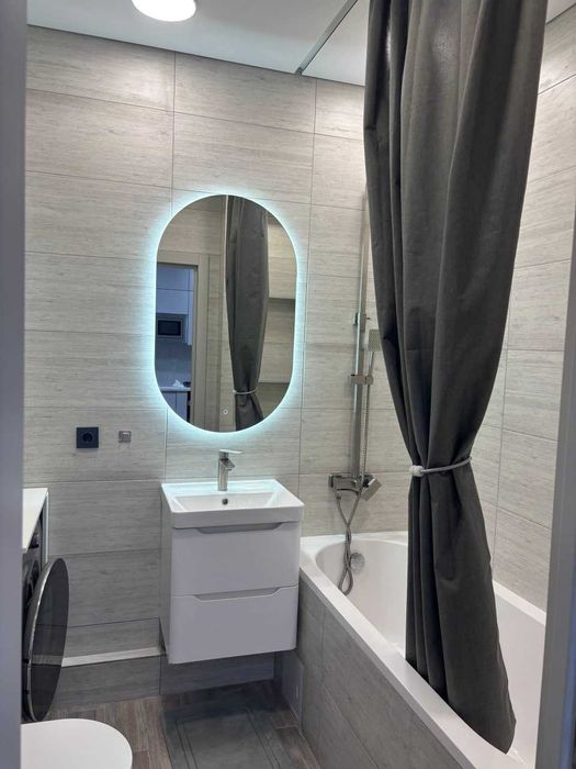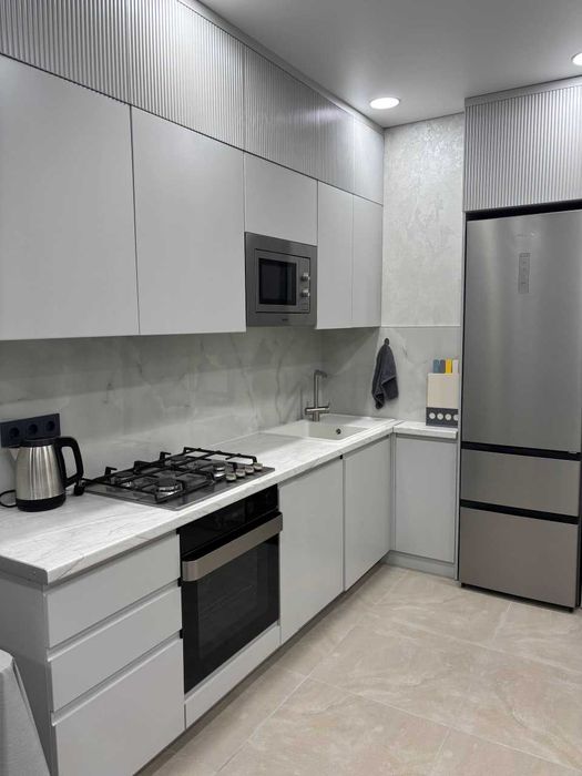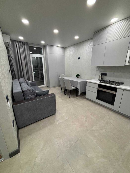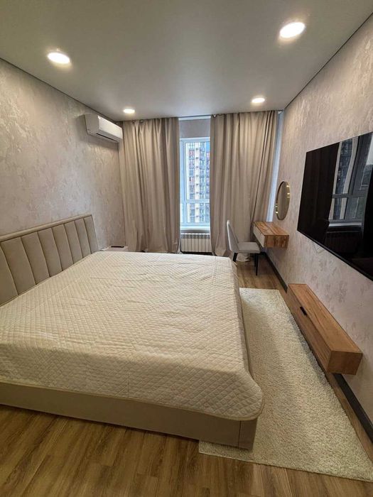 Квартира мебльована та оснащена всією необхідною побутовою технікою: холодильником, пральною та посудомийною машинами, телевізором, а також підключеним інтернетом.