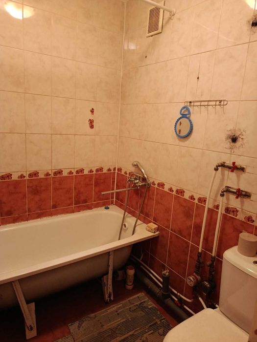 У кухні робоча стіна – в кафелі. Ванна – в кафелі.