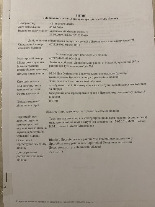 Земельна ділянка 7,5 соток Для будівництва .; Земельна ділянка для обслоговування житлового будинку в дуже гарному районі .Біля гірськолижного курорту Буковиця м .Борислав ,та також 1 км до джерела Нафтуся .Кругом дуже гарні крайовиди ;гори ,ліс ,озера .1.5 км до курорту Трускавець .Поруч всі комунікації .; кадастровий номер: 462184900:01:004:0811