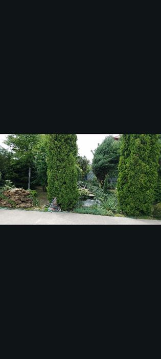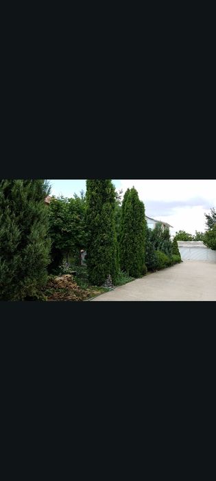 Є великі хвойні дерева,сад.