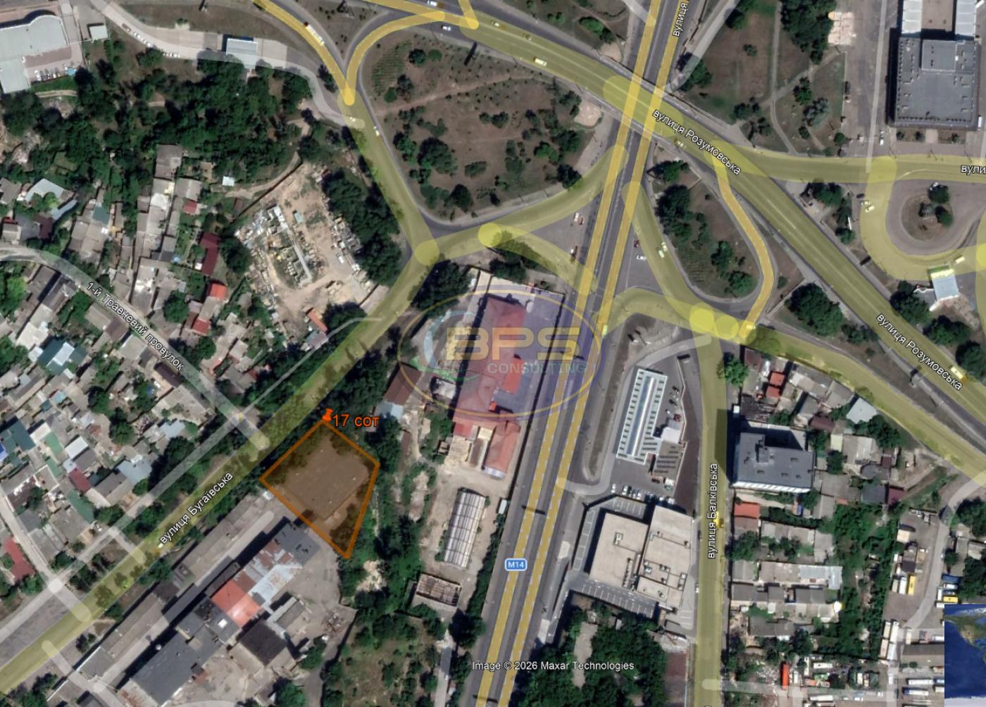 Земельна ділянка 17 соток з ангаром Фасад на вул.Бугаївська – 38 метрів Земля у приватній власності на юридичну особу Цільове призначення - для експлуатація та обслуговування основного виробництва Вид використання - 11.02 Для розміщення та експлуатації основних, підсобних і допоміжних будівель та споруд підприємств переробної, машинобудівної та іншої промисловості Категорія - Землі промисловості, транспорту, зв’язку, енергетики, оборони та іншого призначення Ангар 950 м кв. Два складських приміщення приміщення – 385 та 565 м.кв. Є вбиральня, майстерня, електрощитова Висота ангару 6 метрів Матеріал будівлі – кам’яний та сендвіч-панелі Мережі – каналізація присутня, вода по фасаду, підключення електрики прораховано