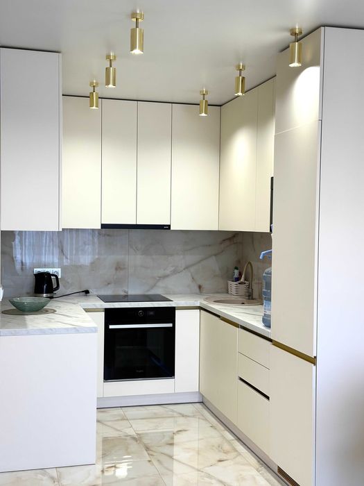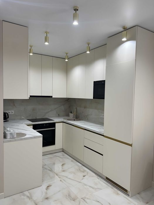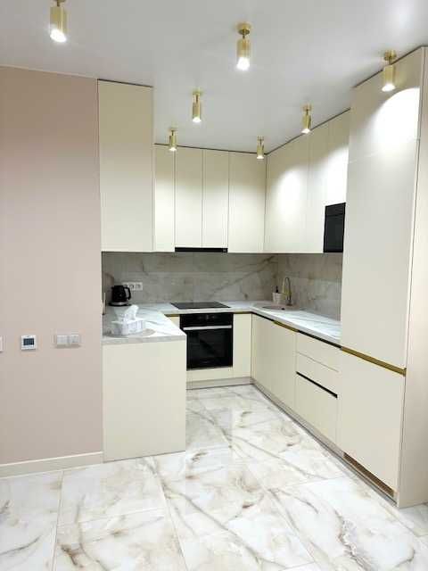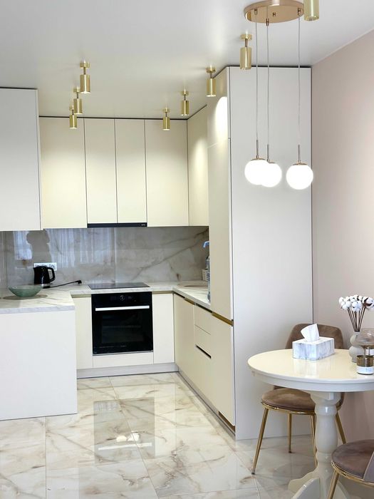 -На кухні: якісна вбудована кухня, італійська робоча поверхня, посудомийна машина Hotpoint-Ariston, двокамерний вбудований холодильник Whirlpool, індукційна варильна поверхня та духова шафа Whirlpool , тепла підлога.