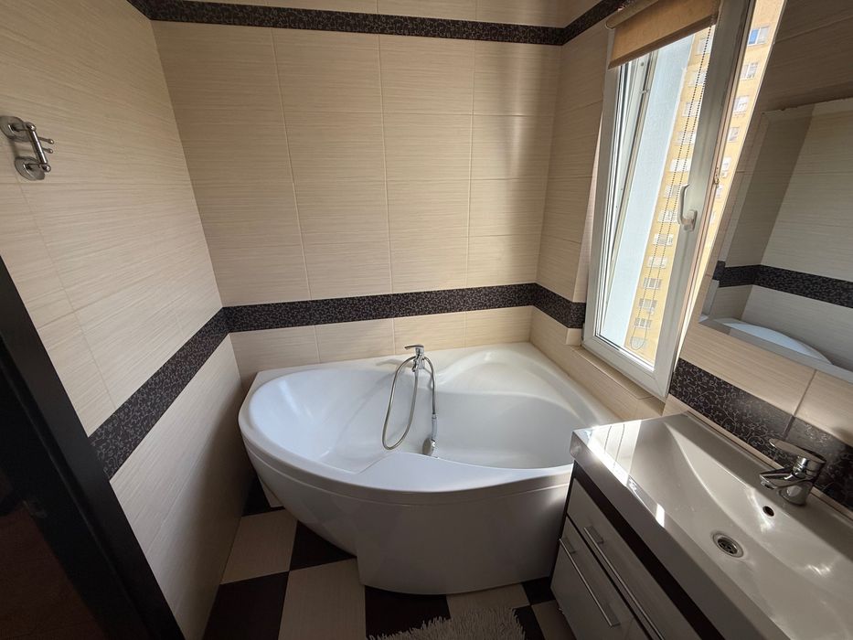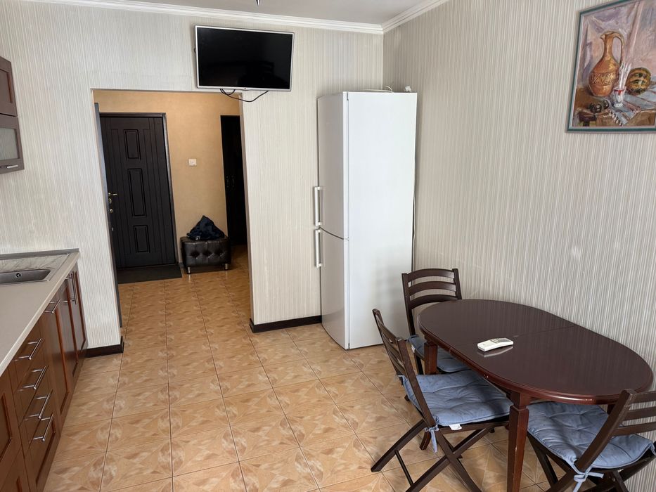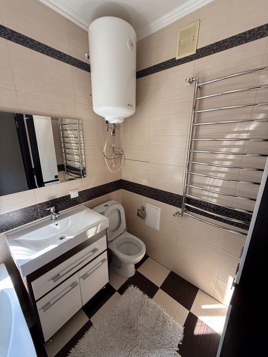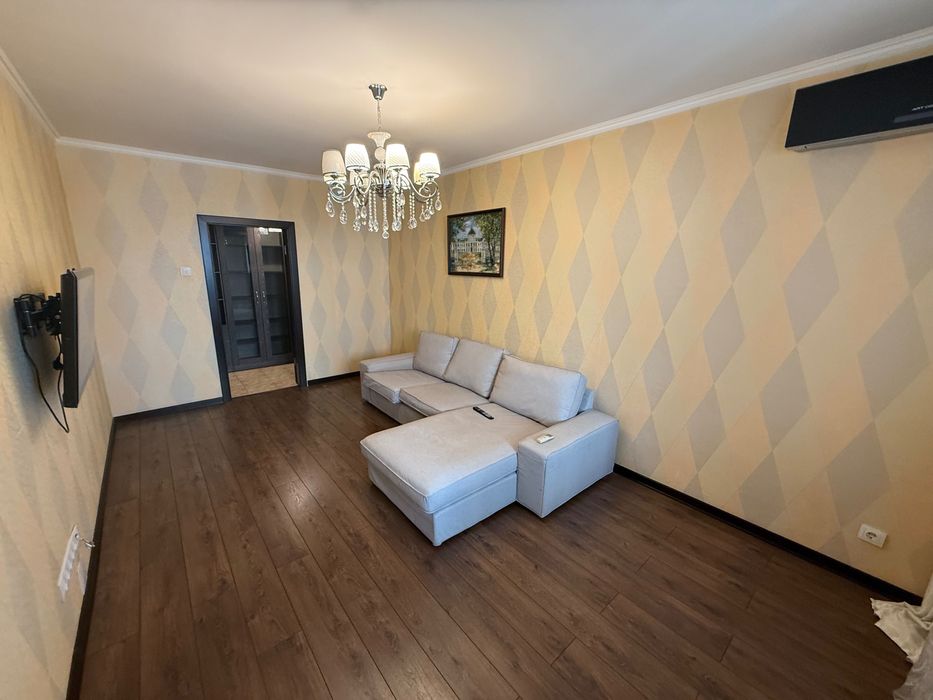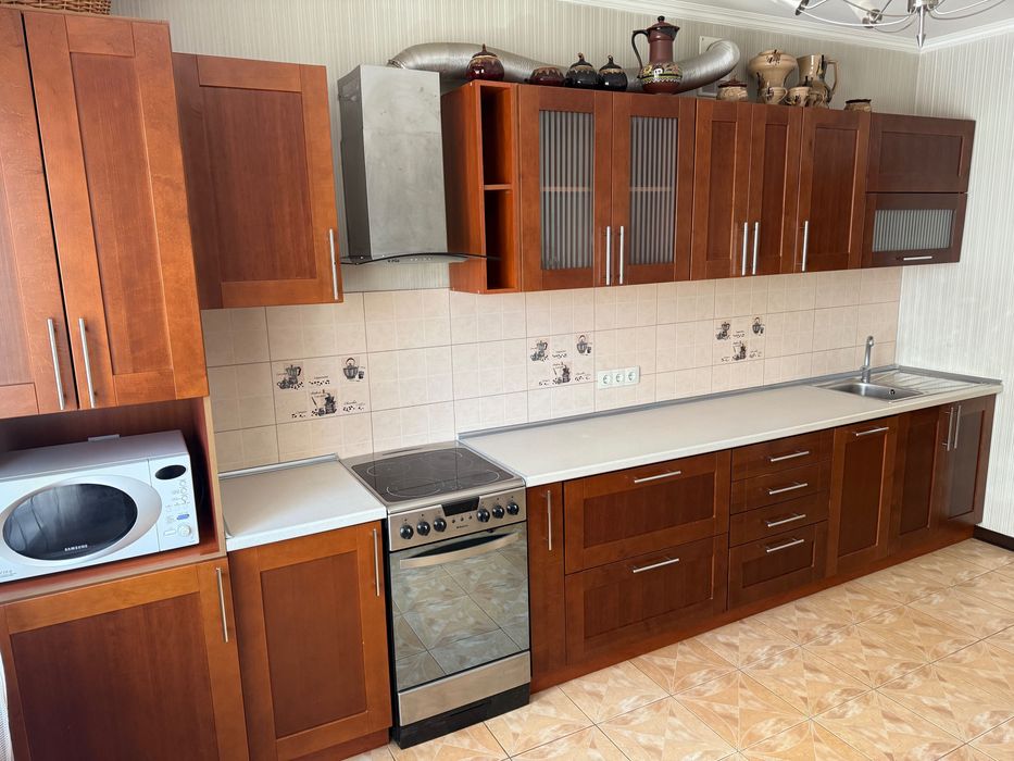 Квартира повністю мебльована та оснащена технікою: вбудована кухня, холодильник, посудомийка, мікрохвильова, електроплита, пральна машина, бойлер, 2 кондиціонери, телевізор, багато шаф для зберігання. Тепла підлога в санвузлі.