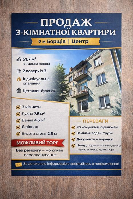 Продається 3-кімнатна квартира в центрі м. Борщів; Світла, простора та затишна квартира загальною площею 51,7 м², розташована на 2 поверсі 3-поверхового цегляного будинку