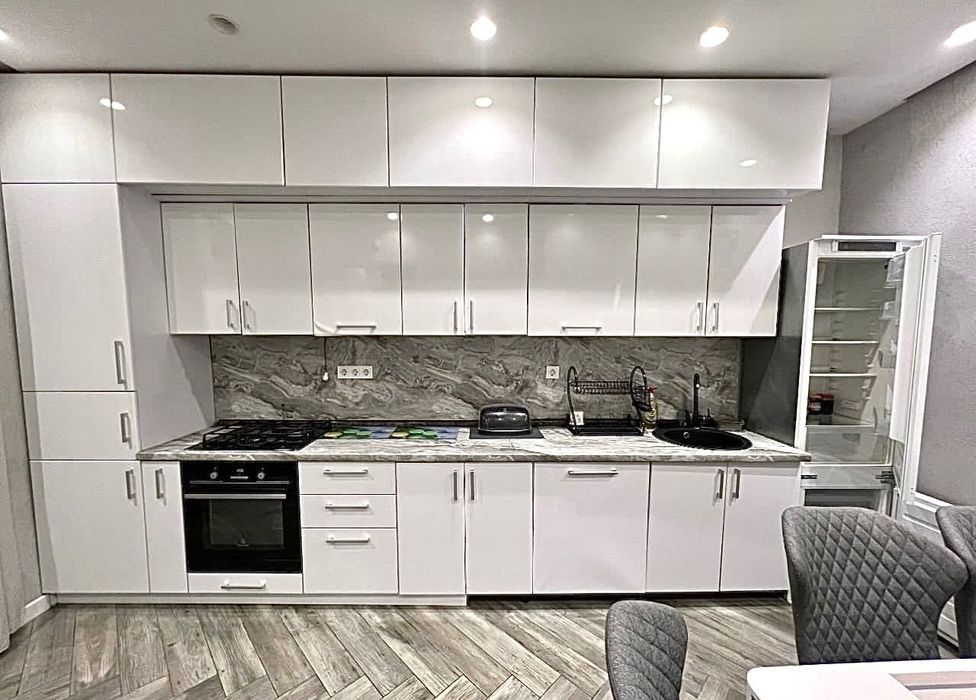 • Кухня преміумкласу: Білосніжні глянцеві фасади до самої стелі — це не лише естетично, а й максимально функціонально (неймовірний об’єм для зберігання). Робоча зона (фартух та стільниця) з фактурою натурального каменю додає інтер’єру статусності та вишуканості.