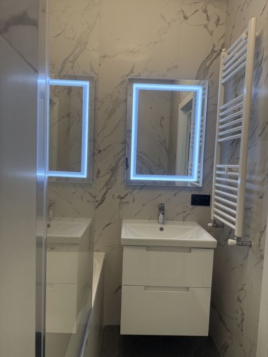 • повноцінний санвузол з ванною, пральною машиною, підігрівом підлоги та дзеркалом з LED-підсвіткою