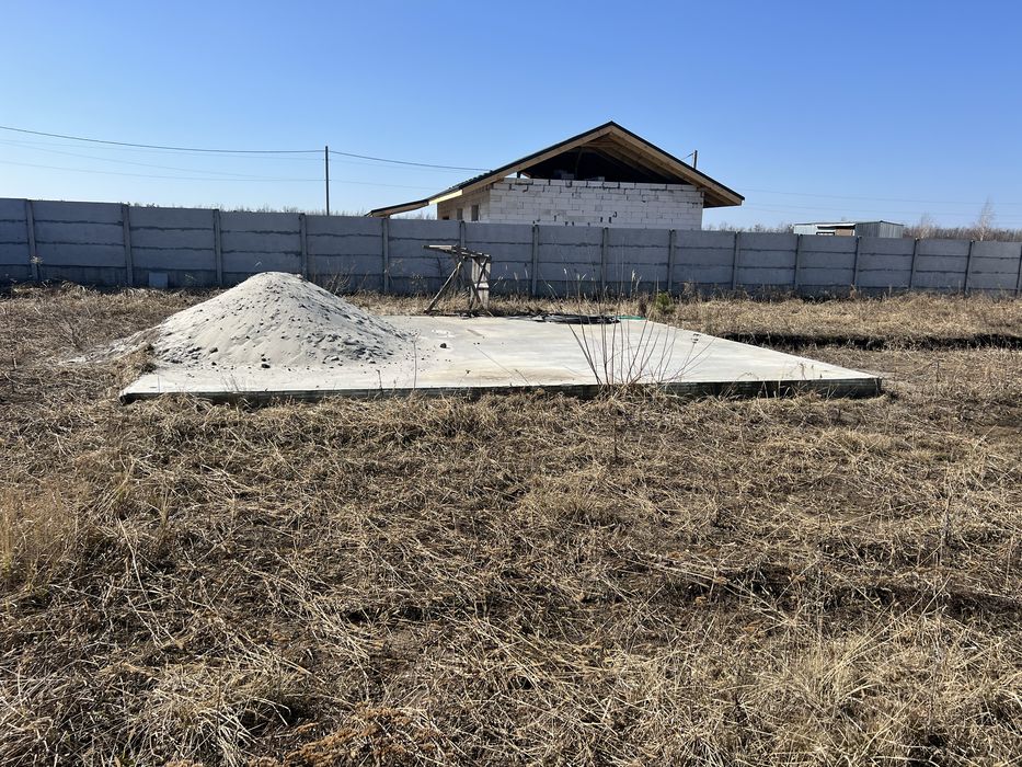 На ділянці є міцний рівний фундамент товщіною 35см з пінополістирольним шаром, розмір 8х8,4метри (підійде, як для зведення на ньому будинка, так і для парковки декількох авто).