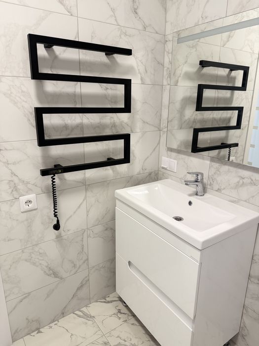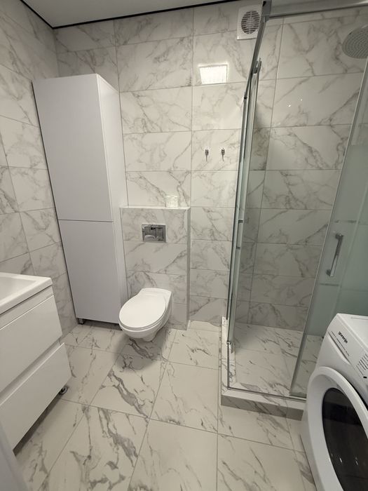 У ванній кімнаті: душова кабіна, прально-сушильна машина, умивальник та шкаф для зберігання, вбудована інсталяція. У ванній кімнаті змонтовано теплу підлогу.