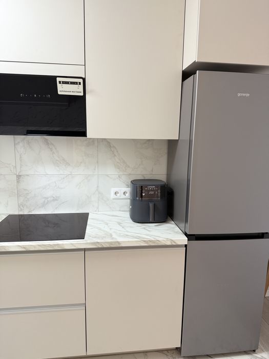 На кухні обідній стіл з стільцями, вбудована кухня, варильна поверхня, витяжка, мікрохвильова піч, холодильник та аерогриль.