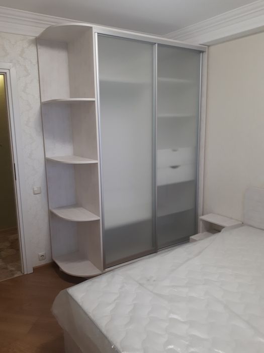 Зручне двоспальне ліжко з ортопедичним матрацом, місткі шафи-купе, комфортний розкладний диван у вітальні.