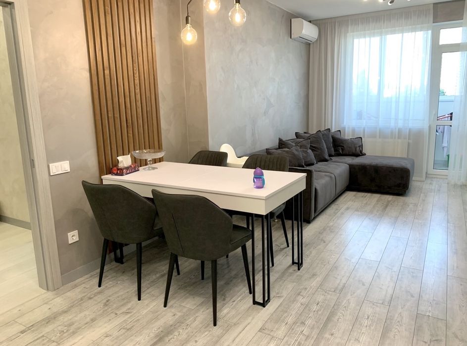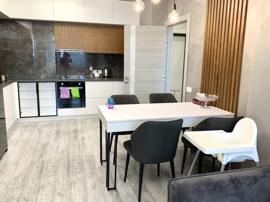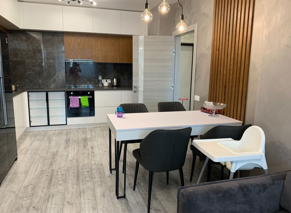 Кухня: індукційна плита, духовка, великий місткий двохкамерний холодильник та морозильна камера, кондиціонер, мікрохвильова піч, чайник, великий розкладний стіл та великий зручний розкладний диван