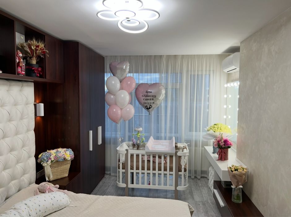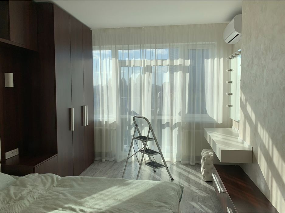 Спальня: кондиціонер, двох спальне ліжко, величезна шафа на всю стіну для зберігання речей, відкритий балкон з виглядом на ЖК Манхеттен.