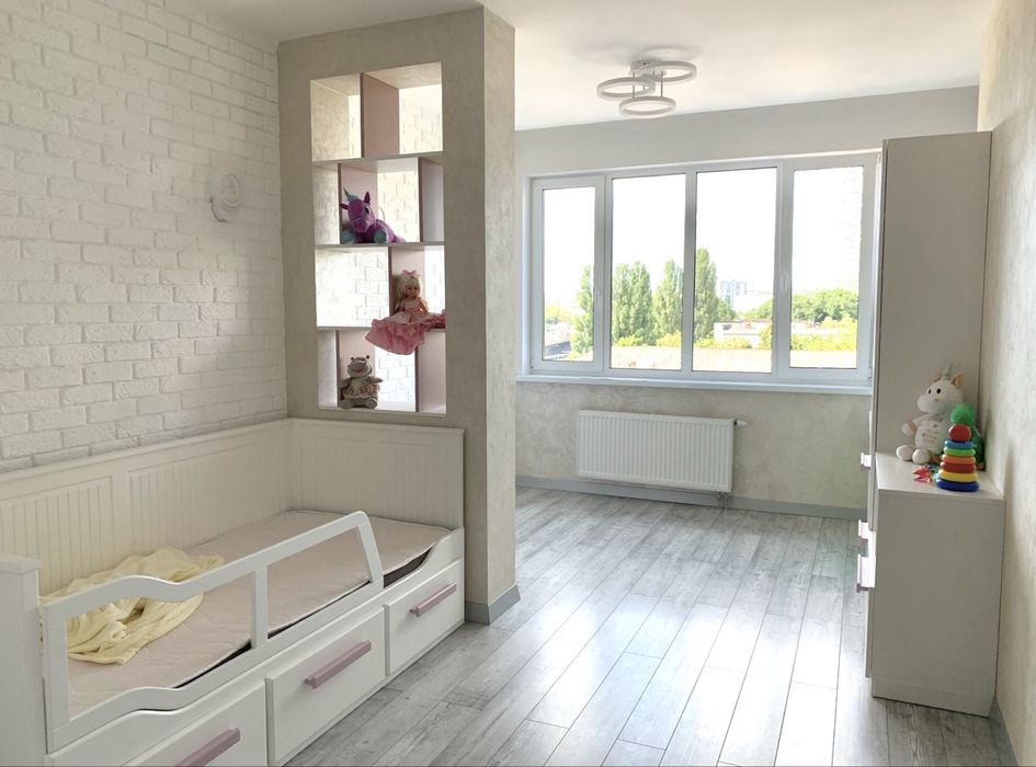 Дитяча: дитяче ліжко, робоча зона, велика шафа на всю стіну + шафи та полиці для зберігання окремо в кімнаті.