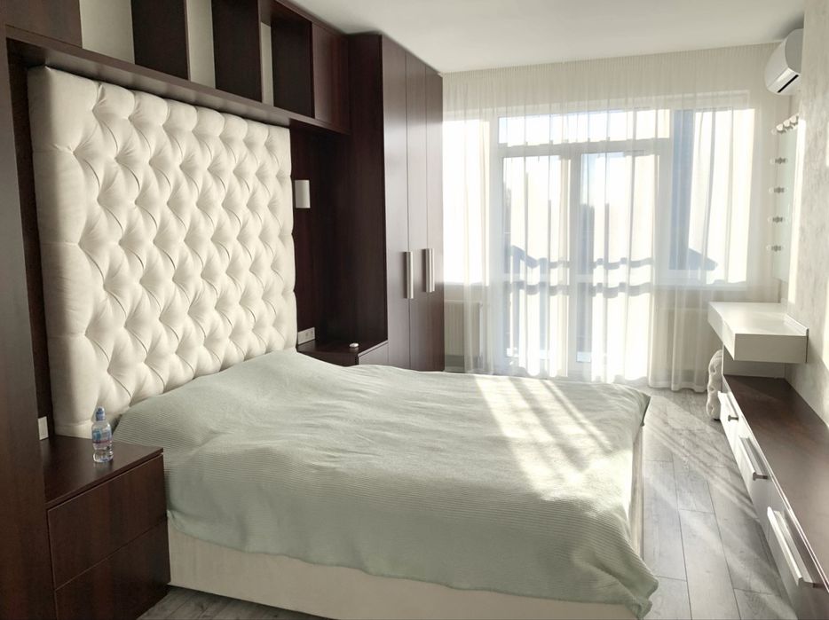 Спальня: кондиціонер, двохспальне ліжко, величезна шафа на всю стіну для зберігання речей, відкритий балкон з виглядом на ЖК Манхеттен.