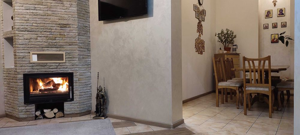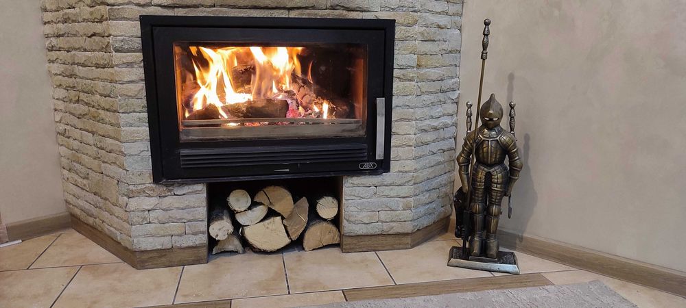 -камин на дровах с тепловой «рубашкой» на радиаторы;