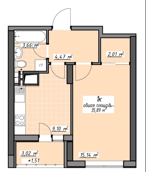 Квартира общей площадью 36 кв. на 10 этаже.