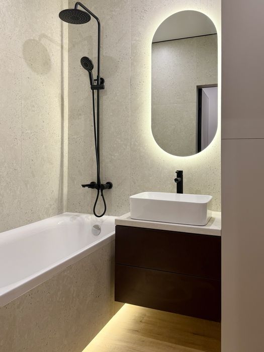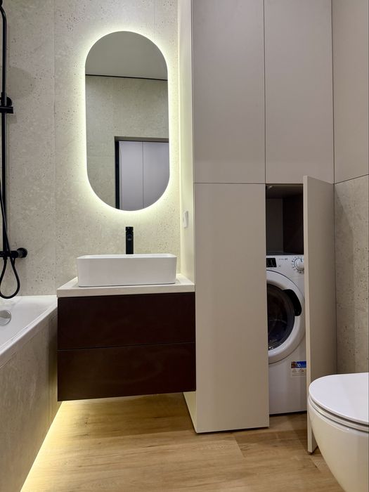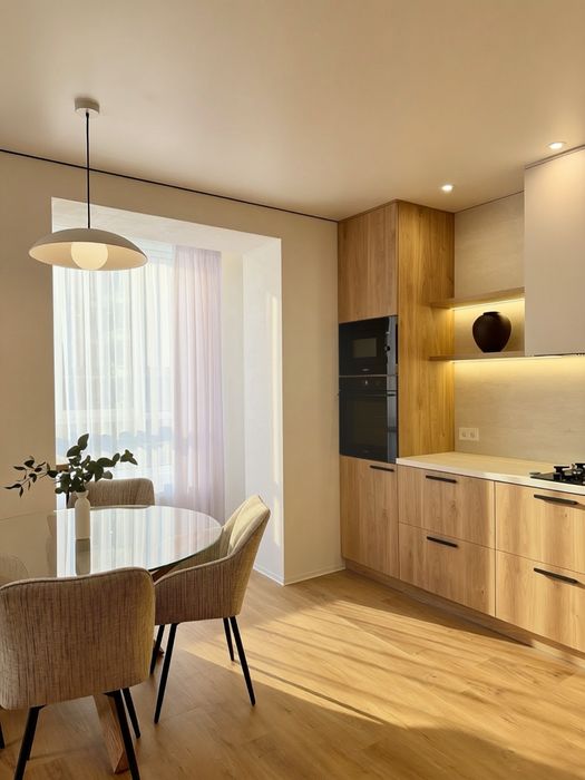 Техніка: прально-сушильна машина, посудомийка 60, вбудований холодильник, кондиціонер, духова шафа, мікрохвильовка, smart tv 55, варочна поверхня. Газове опалення.