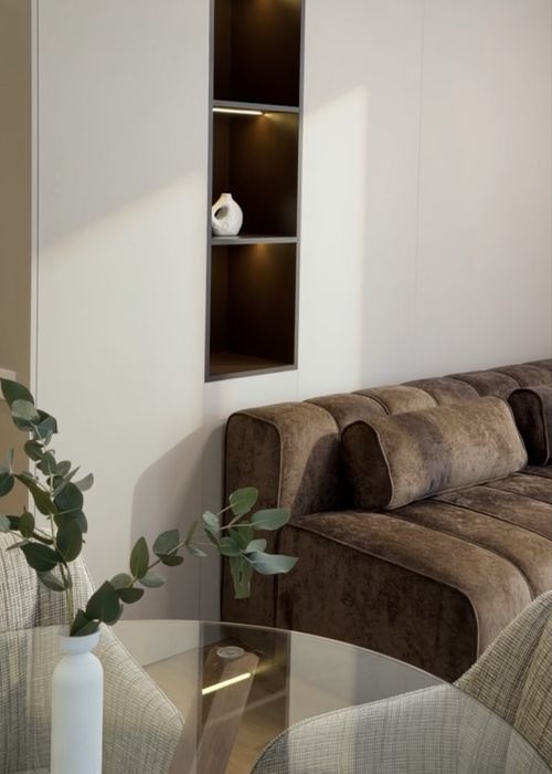 Простора кухня-вітальня з розкладним диваном кольору шоколад.
