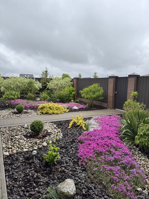 Ззовні теж все облаштовано, квіти, кущі, сад, місце для барбекю.