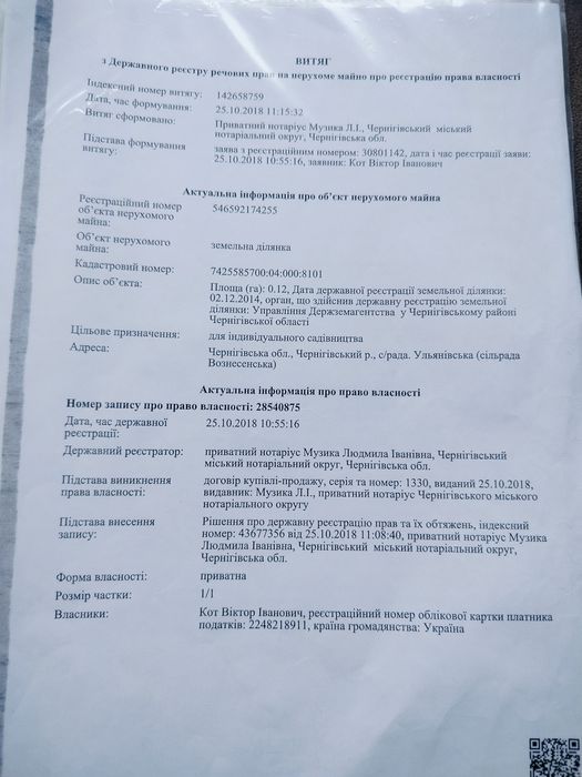 Продам земельну ділянку 12 соток; Продам земельну ділянку 12 соток, чорнозем, в гарному місці , неподалік ліс, всі питання за телефоном, дякую.; кадастровий номер: Кадастровый номер: Кадастровый номер: 7425585700:04:000:8101
