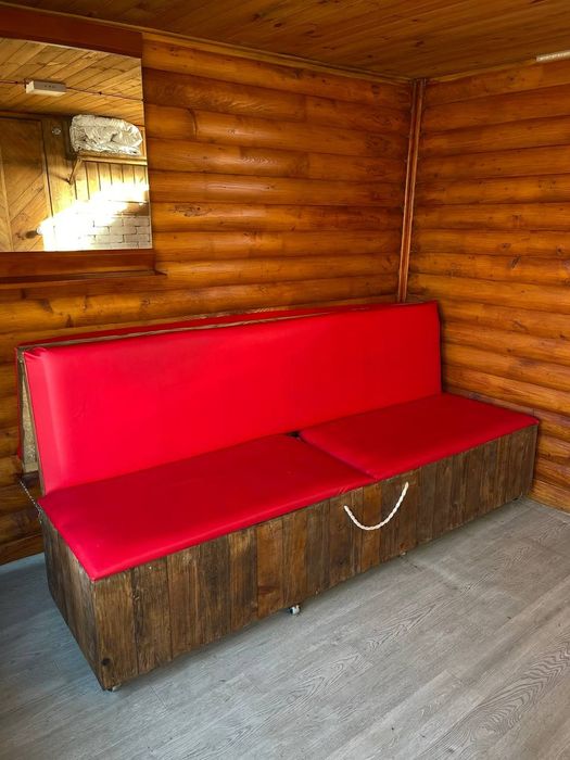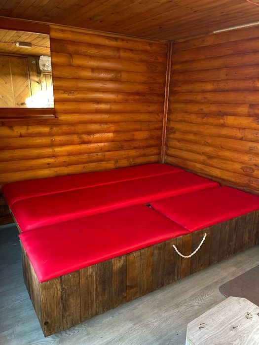 Всередині облаштована зона відпочинку з розкладним диваном, виготовленим власноруч. Все продумано для комфортного користування.