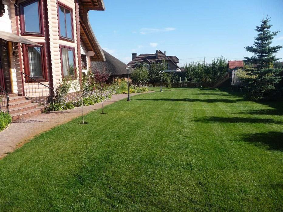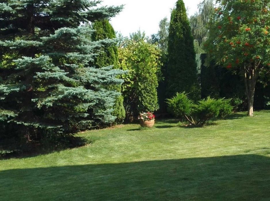 * Доглянута ділянка з хвойними та плодовими деревами, газоном.