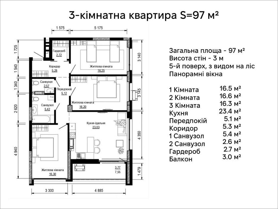 * 97 м² - загальна площа, вільне планування