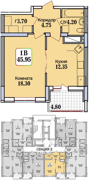 Загальною площею 45,7квадратів з лоджією . В 2 секції . Вигляд з вікон у двір .