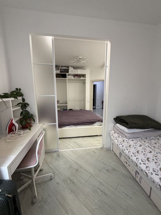 Диван на кухні, спальня розділена скляною перегородкою, де відокремлена дитяче ліжко і стіл. Для молодої сімʼї буде ідеально.