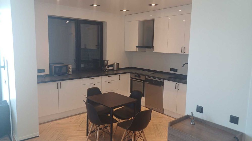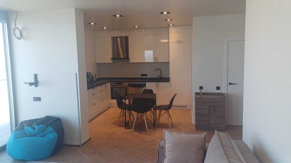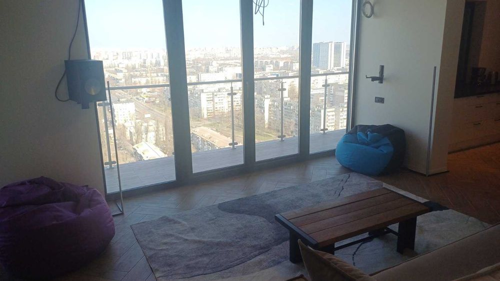 Інтер’єр виконаний у сучасному преміальному стилі з використанням якісних матеріалів та техніки. Квартира повністю мебльована та укомплектована: встановлена висококласна акустична система, пральна та сушильна машини, повністю обладнана кухня та комфортні меблі для проживання без додаткових витрат.