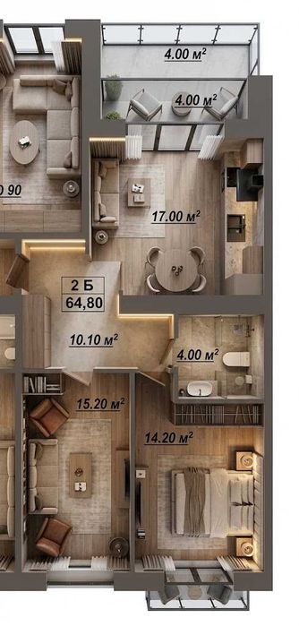 2 окремі спальні + кухня-гостинна