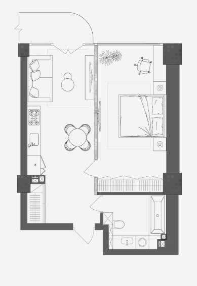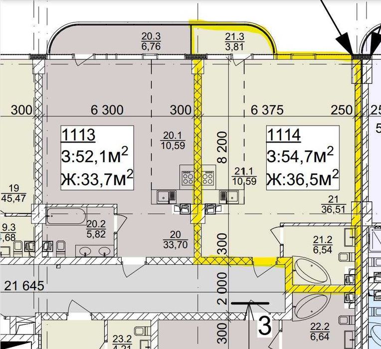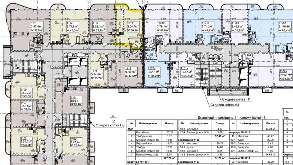 Площа 54,15 кв. м. На картинці з плануванням позначена жовтим кольором.